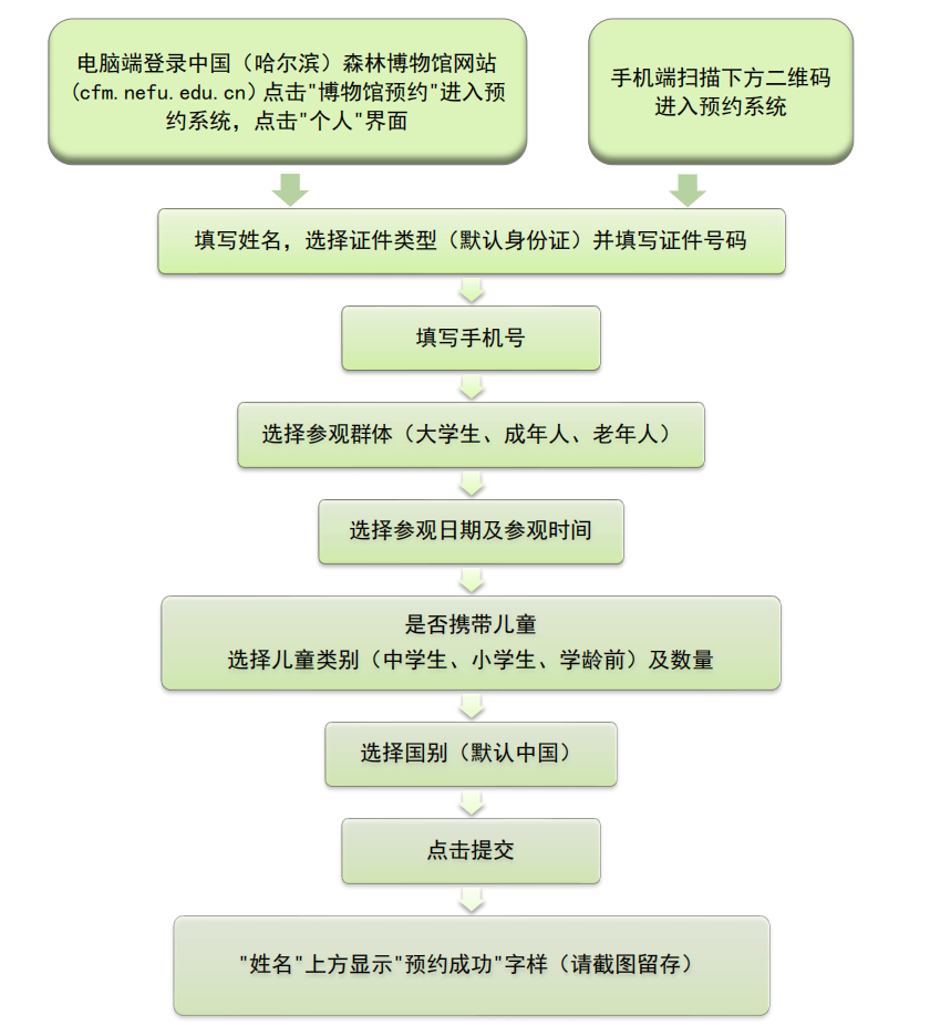 中国(哈尔滨)森林博物馆实行实名制免费预约和入馆必检参观制,个人可提前1日预约次日参观,9:00准时开放预约系统。入馆时需提供预约时使用的有效身份证原件核验预约信息。同一身份证号码同一天内可预约一次,入馆核验后预约失效,出馆后不能再进入。